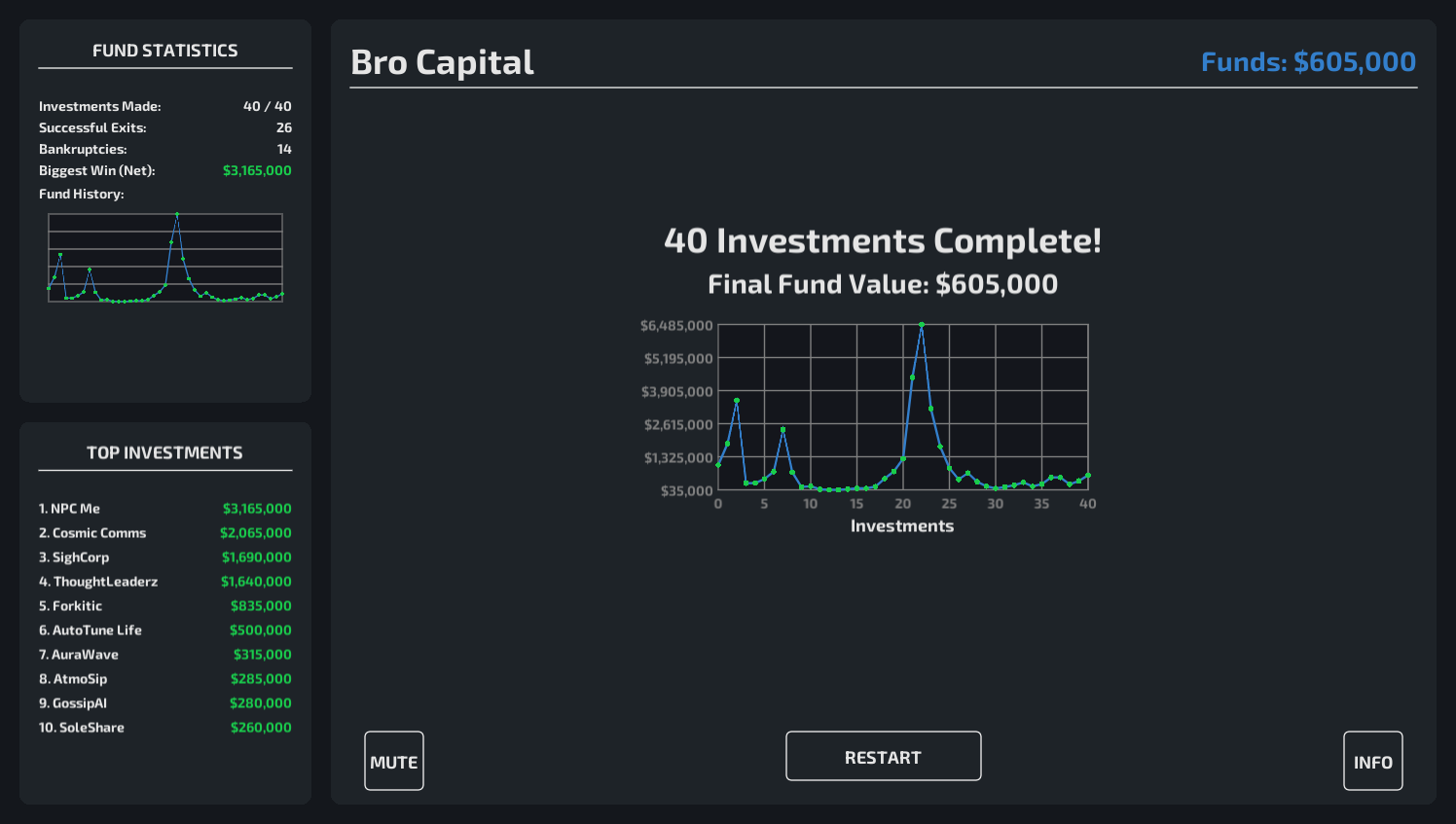 I reached 5.5M but then went bankrupt... haha, in real life I'm not very good at the stock market and probably online either lol. Nice interface! The idea of the snapshot button is amazing!